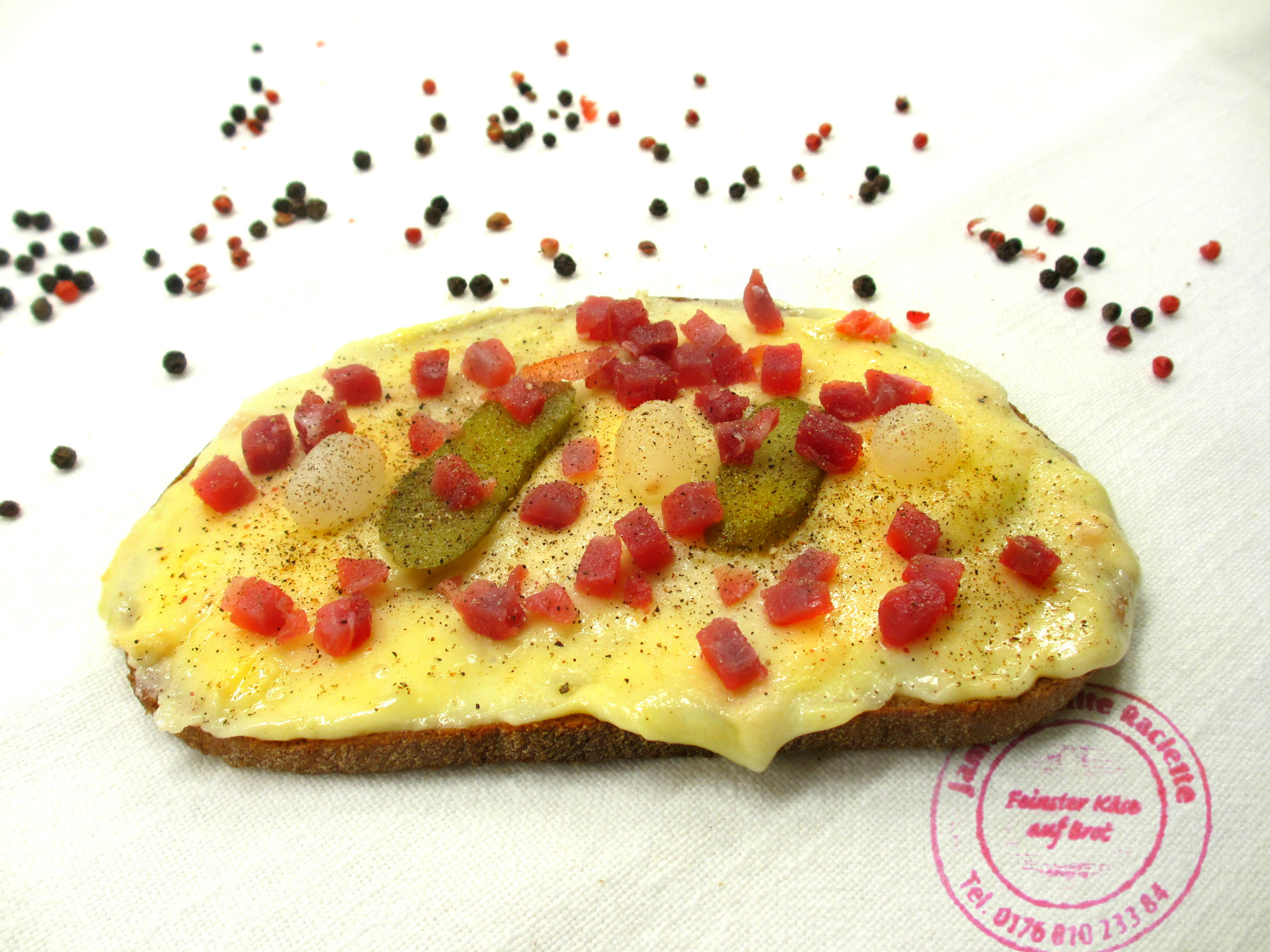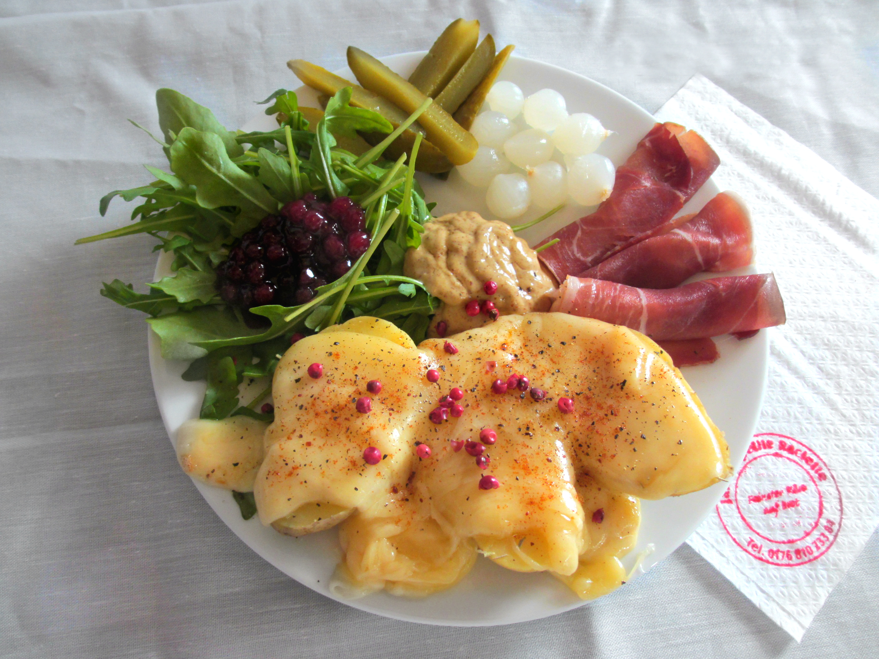 Das traditionelle, der Ursprung des Raclettekäse wie er aufs Brot kam. Zusammen mit leicht angeröstetem Schinken garniert mit Gürkchen und Perlzwiebeln ein Genuss.